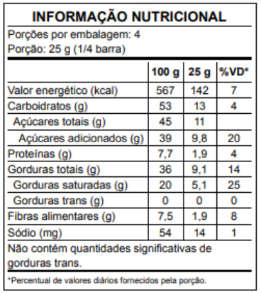 Ingredientes: Chocolate ao leite 45% cacau (açúcar demerara orgânico, amêndoas de cacau, manteiga de cacau, leite em pó integral, lecitina de girassol orgânica.), castanha-do-pará, castanha-de-caju,e castanha de baru.